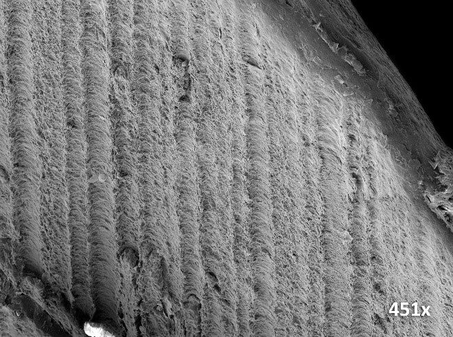 The onychodermal band is NOT another kind of tissue even though it does form a distinct region. The onychodermal band is also created by the bed epithelium. How? As the bed epithelium moves with the nail plate, it must somehow squeeze past the hyponychium, which is the seal under the free edge that prevents pathogens from infecting the nail bed. It’s a tight squeeze getting past this seal, but the bed epithelium manages to squeeze past. In doing so, it becomes bunched up and doesn’t flow smoothly past the hyponychium. This “bunching” causes a rippling effect which creates a barrier that prevents penetration of substances from seeping past the hyponychium, so this helps to protect the nail bed.