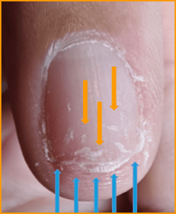 If we look at photo 2 and the yellow arrows, we need first to seal the upper layers of the nail plate before applying more Gel Polish, and if we cannot do that a more permanent base coat will need to be applied, if we don’t do this we will create pockets for air, moisture or both under our gel polish