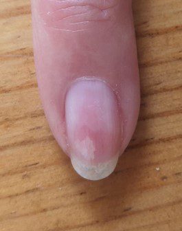In this image, you can clearly see how psoriasis can affect it. When the ‘oil slick’ blister forms, the bed epithelium is directly affected by the upwards pressure of the blister dislodging it from the nail bed. As the nail plate moves (perpetual motion) and the damaged bed epithelium gets closer to the free edge onycholysis is a fact and the nail bed is exposed to any and all pathogens.