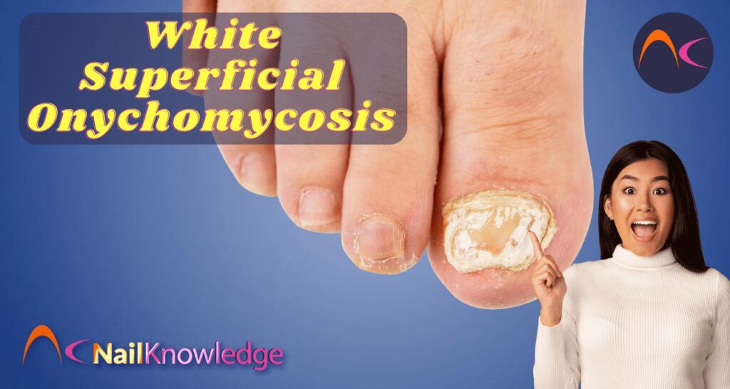 Bệnh nấm móng nông màu trắng, often abbreviated to ‘WSO’, is a condition where white spots are seen on the superficial layer of the tấm móng tay; unlike Bạch móng though, these white spots can be filed off and are as a result of nhiễm trùng nấm thay vì bất kỳ ma trận dystrophy. The condition is commonly caused by a fungal species from the Trichophyton family and is highly infectious.