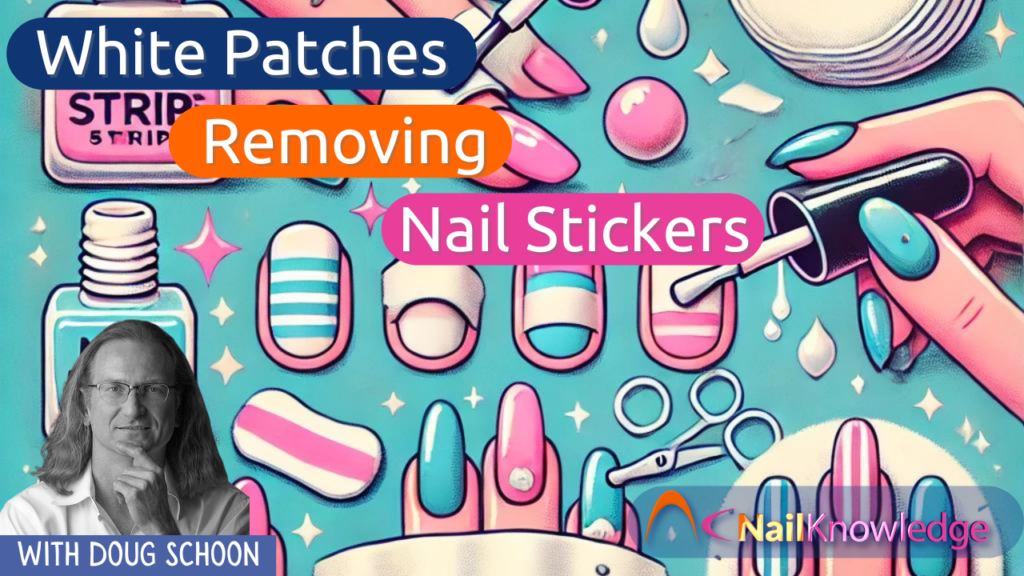 Một vấn đề phổ biến nhiều thợ làm móng chuyên nghiệp khuôn mặt của khách hàng đang phát triển các mảng trắng trên tấm móng tay sau khi loại bỏ chất kết dính miếng dán móng tay. Một câu hỏi thường được đặt ra là: "Tôi sử dụng một số nhãn hiệu miếng dán móng tay trang trí. Khi tôi tháo chúng ra, một số khách hàng phát triển các mảng trắng lớn trên phiến móng. Tại sao điều này xảy ra và làm thế nào tôi có thể ngăn chặn nó? Khách hàng của tôi đang đổ lỗi cho tôi.